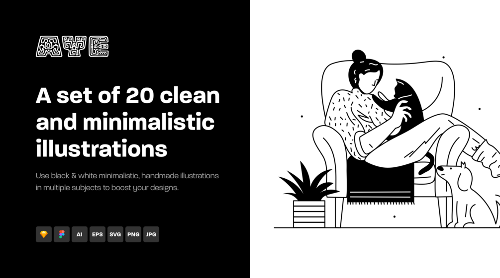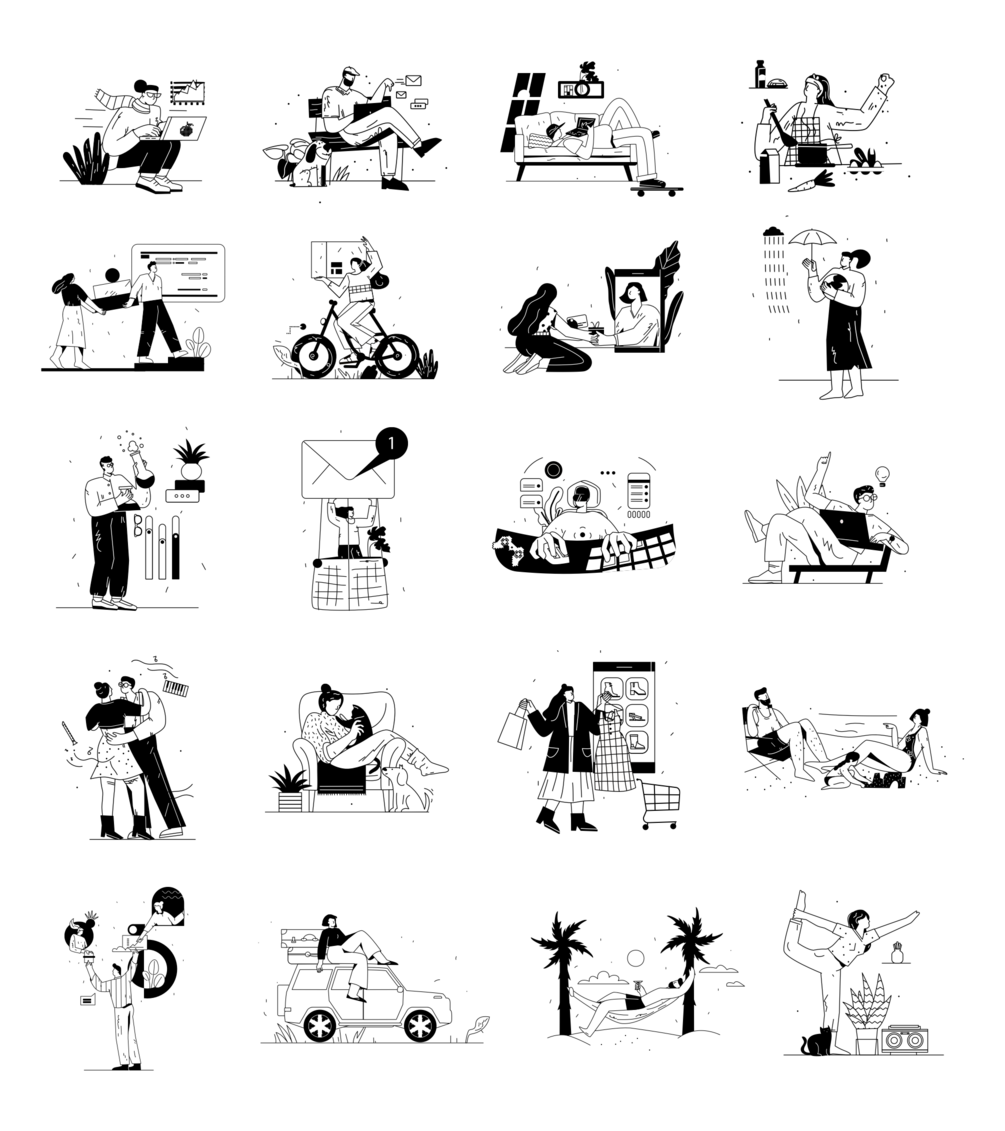 20 vector, minimalistic, black & white illustrations with a unique touch to your projects. Ideal for websites, web applications, mobile applications, marketing materials, printouts, social media posts, templates, work presentations, or just another fancy Dribbble shot.