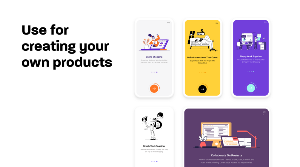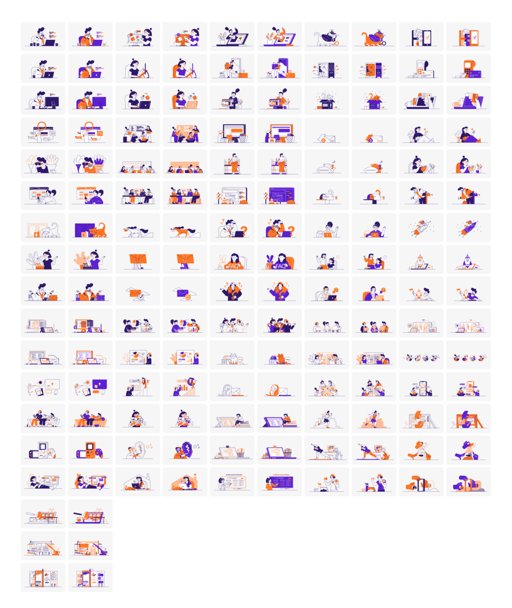You can also change colors at once for all 156 static illustrations with just a few clicks in Sketch, Figma, or Adobe XD to fit the color palette of your product or brand (a template for each software mentioned above included).